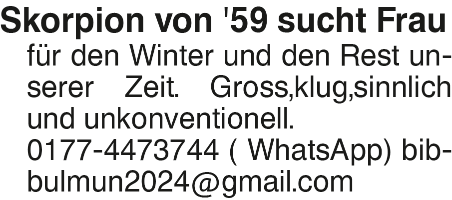 Skorpion von '59 sucht Fr für den Winter und den Rest unserer Zeit. Gross,klug,sinnlich und unkonventionell. 0177-4473744 ( WhatsApp) bibbulmun2024@gmail.comDas könnte Sie auch interessieren