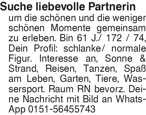 Suche liebevolle Partneri um die schönen und die weniger schönen Momente gemeinsam zu erleben. Bin 61 J./ 172 / 74, Dein Profil: schlanke/ normale Figur. Interesse an, Sonne & Strand, Reisen, Tanzen, Spaß am Leben, Garten, Tiere, Wassersport. Raum RN bevorz. Deine Nachricht mit Bild an WhatsApp 015156455743 Tel. 0151-56455743Das könnte Sie auch interessieren