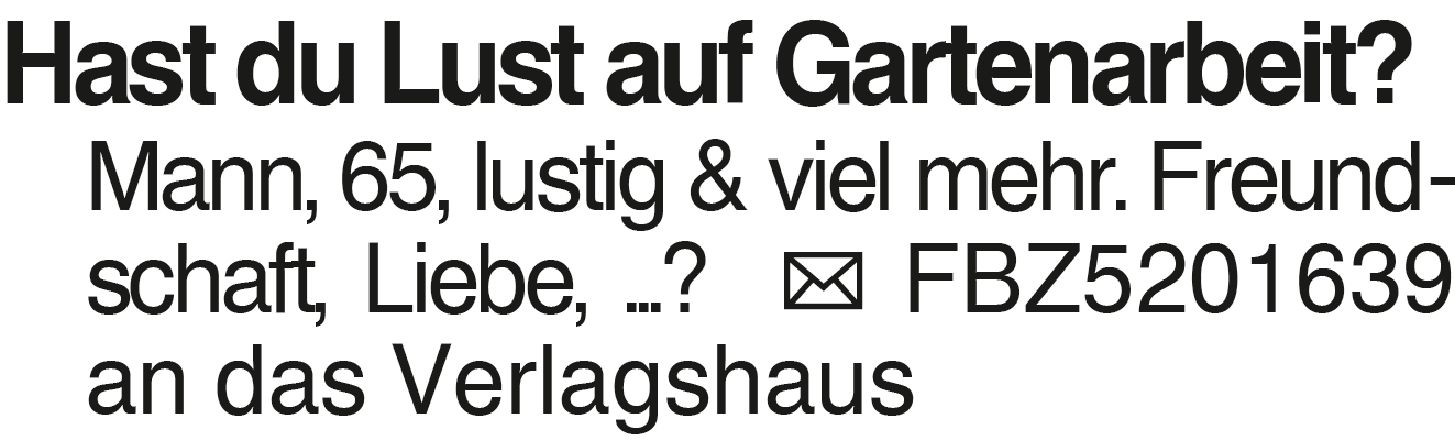 Hast du Lust auf Gartenar Hast du Lust auf Gartenarbeit? Mann, 65, lustig & viel mehr. Freundschaft, Liebe, ...? FBZ5201639 an das VerlagshausDas könnte Sie auch interessieren