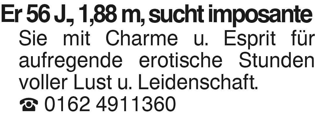 Er 56 J., 1,88 m, sucht i Er 56 J., 1,88 m, sucht imposante Sie mit Charme u. Esprit für aufregende erotische Stunden voller Lust u. Leidenschaft. 0162 4911360Das könnte Sie auch interessieren