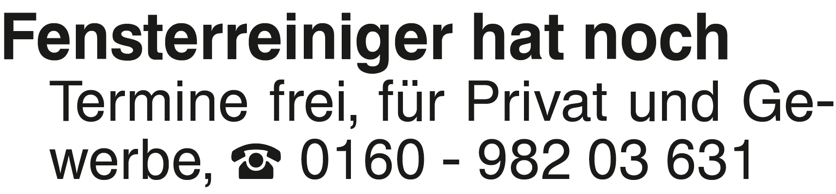 Anzeige Fensterreinigung Fensterreiniger hat noch Termine frei, für Privat und Gewerbe, 0160 - 982 03 631Das könnte Sie auch interessieren
