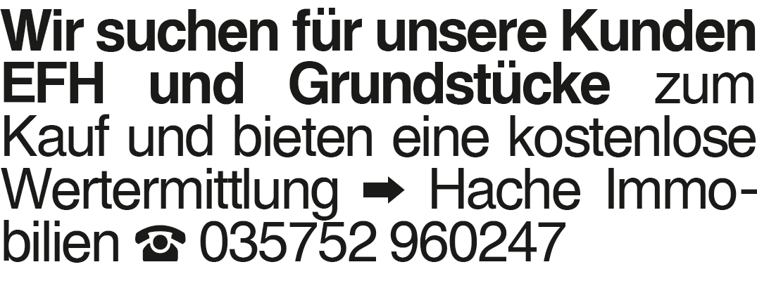 Wir suchen für unsere Kunden Wir suchen für unsere Kunden EFH und Grundstücke zum Kauf und bieten eine kostenlose Wertermittlung Hache Immobilien 035752 960247Das könnte Sie auch interessieren