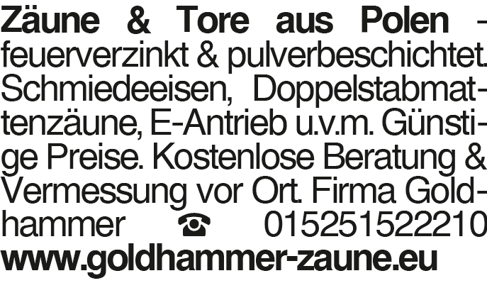 Zäune & Tore aus Polen - Zäune & Tore aus Polen - feuerverzinkt & pulverbeschichtet. Schmiedeeisen, Doppelstabmattenzäune, E-Antrieb u.v.m. Günstige Preise. Kostenlose Beratung & Vermessung vor Ort. Firma Goldhammer 015251522210 www.goldhammer-zaune.euDas könnte Sie auch interessieren