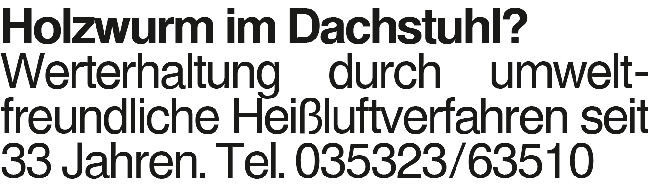 Holzwurm im Dachstuhl? We Holzwurm im Dachstuhl? Werterhaltung durch umweltfreundliche Heißluftverfahren seit 33 Jahren. Tel. 035323/63510