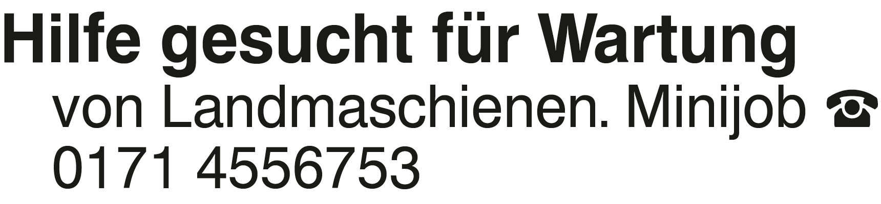 Hilfe gesucht für Wartung Hilfe gesucht für Wartung von Landmaschienen. Minijob 0171 4556753Das könnte Sie auch interessieren
