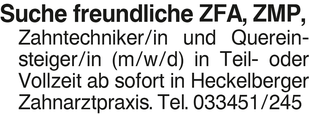 Suche freundliche Suche freundliche ZFA, ZMP, Zahntechniker/in und Quereinsteiger/in (m/w/d) in Teil- oder Vollzeit ab sofort in Heckelberger Zahnarztpraxis. Tel. 033451/245Kontakt