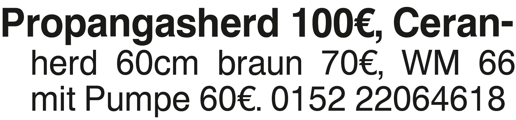 Propangasherd 100 EUR, Ce Propangasherd 100 EUR, Ceran- herd 60cm braun 70 EUR, WM 66 mit Pumpe 60 EUR. 0152 22064618Das könnte Sie auch interessieren
