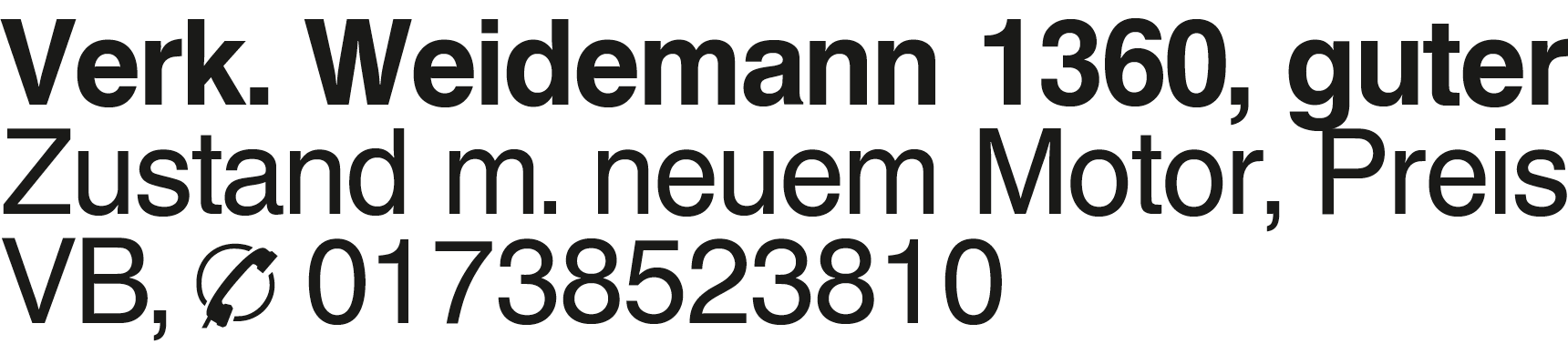 Verk. Weidemann 1360, gut Verk. Weidemann 1360, guter Zustand m. neuem Motor, Preis VB, 01738523810Kontakt