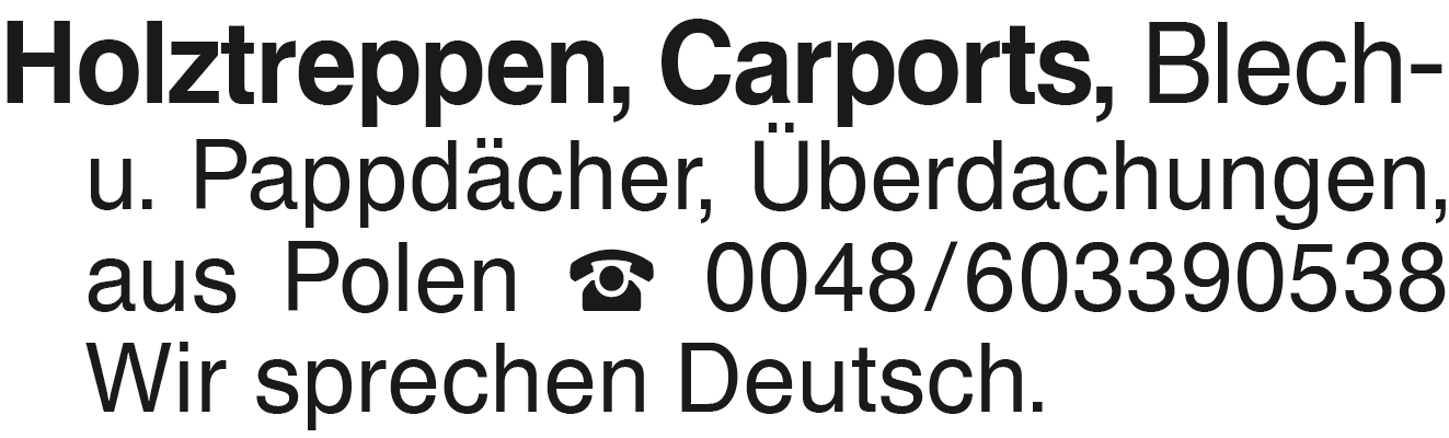 Holztreppen, Carports, Bl Holztreppen, Carports, Blech- u. Pappdächer, Überdachungen, aus Polen 0048/603390538 Wir sprechen Deutsch.Das könnte Sie auch interessieren