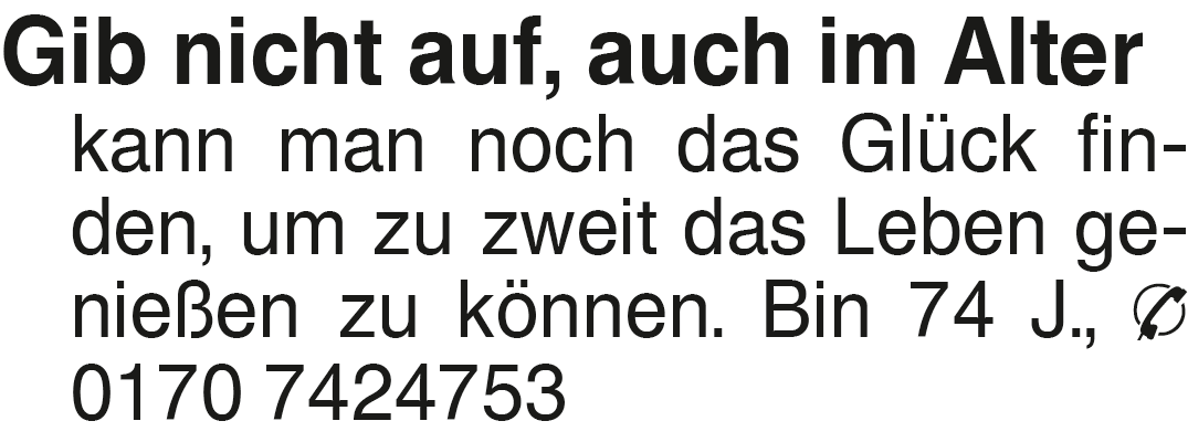 Gib nicht auf, auch im Al Gib nicht auf, auch im Alter kann man noch das Glück finden, um zu zweit das Leben genießen zu können. Bin 74 J., 0170 7424753Das könnte Sie auch interessieren