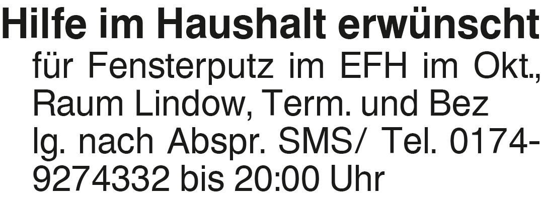 Hilfe im Haushalt erwünsc für Fensterputz im EFH im Okt., Raum Lindow, Term. und Bez lg. nach Abspr. SMS/ Tel. 0174-9274332 bis 20:00 UhrDas könnte Sie auch interessieren