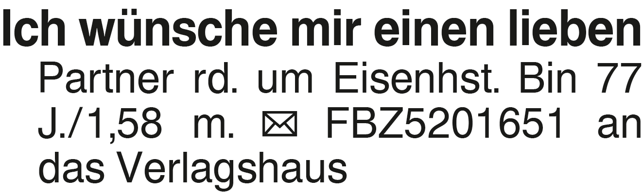 Ich wünsche mir einen lie Ich wünsche mir einen lieben Partner rd. um Eisenhst. Bin 77 J./1,58 m. FBZ5201651 an das Verlagshaus