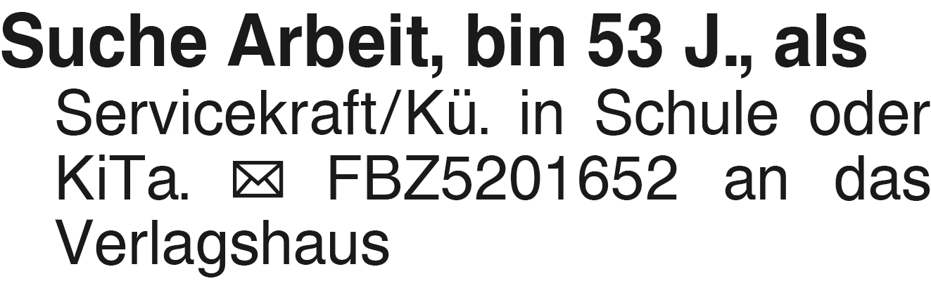 Suche Arbeit, bin 53 J., Suche Arbeit, bin 53 J., als Servicekraft/Kü. in Schule oder KiTa. FBZ5201652 an das VerlagshausKontakt