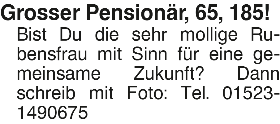 Grosser Pensionär, 65, 18 Bist Du die sehr mollige Rubensfrau mit Sinn für eine gemeinsame Zukunft? Dann schreib mit Foto: Tel. 01523-1490675