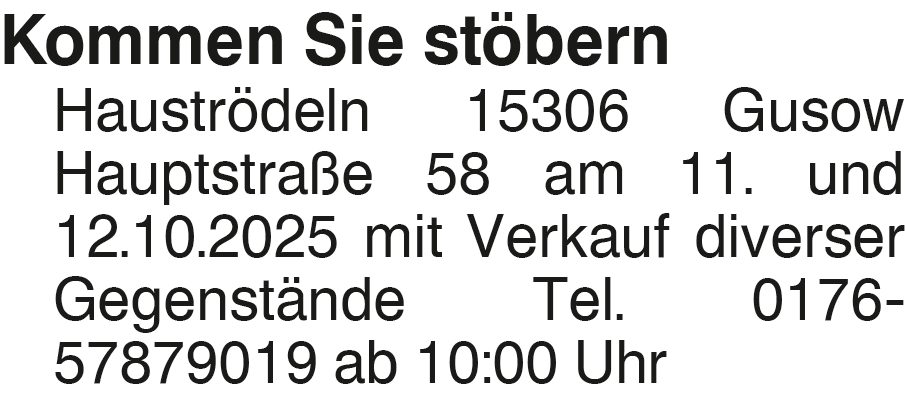 Kommen Sie stöbern Haustr Hauströdeln 15306 Gusow Hauptstraße 58 am 11. und 12.10.2025 mit Verkauf diverser Gegenstände Tel. 0176-57879019 ab 10:00 Uhr