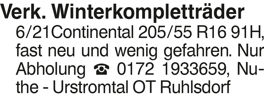 Verk. Winterkompletträder Verk. Winterkompletträder 6/21Continental 205/55 R16 91H, fast neu und wenig gefahren. Nur Abholung 0172 1933659, Nuthe - Urstromtal OT RuhlsdorfDas könnte Sie auch interessieren