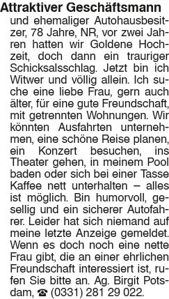Erscheinungsdatum: Anzeige vom 11.10.2025 in der Rubrik "Ehe-/ Partnervermittlungen"
