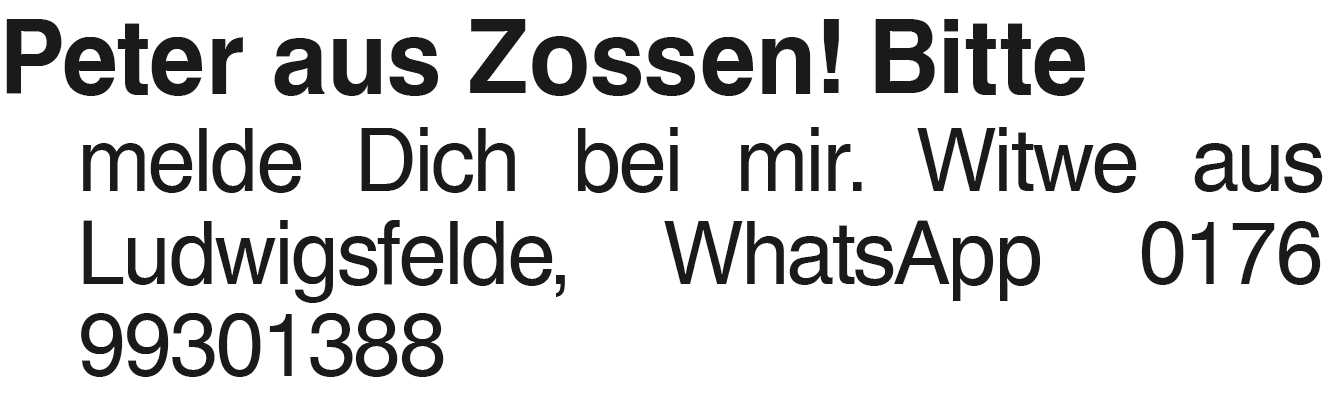 Peter aus Zossen! Bitte m Peter aus Zossen! Bitte melde Dich bei mir. Witwe aus Ludwigsfelde, WhatsApp 0176 99301388