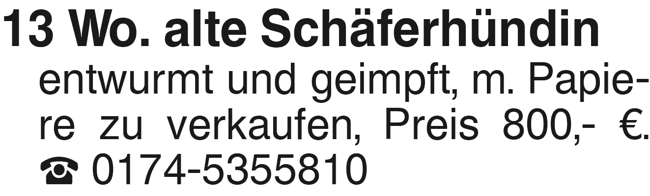 13. Wo. Schäferhündin 13 Wo. alte Schäferhündin entwurmt und geimpft, m. Papiere zu verkaufen, Preis 800,- EUR. 0174-5355810Das könnte Sie auch interessieren
