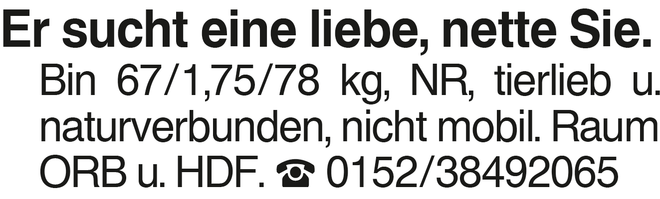 Er sucht eine liebe, nett Er sucht eine liebe, nette Sie. Bin 67/1,75/78 kg, NR, tierlieb u. naturverbunden, nicht mobil. Raum ORB u. HDF. 0152/38492065