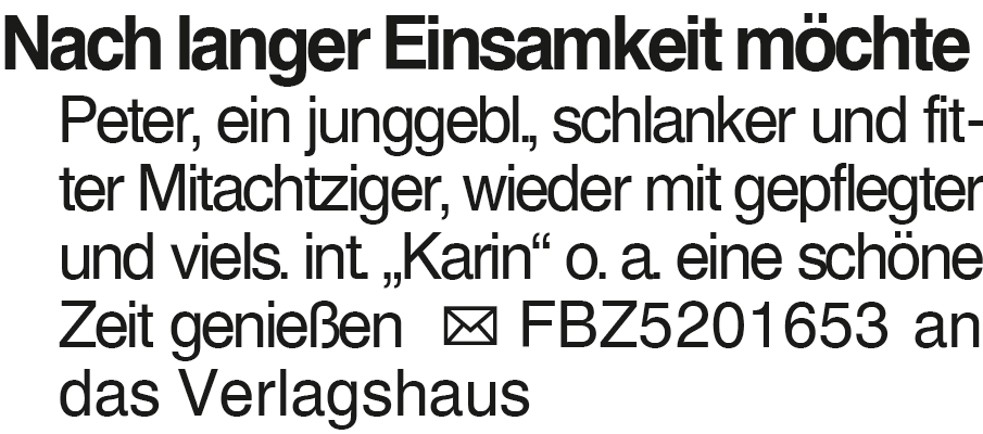 Nach langer Einsamkeit mö Nach langer Einsamkeit möchte Peter, ein junggebl., schlanker und fitter Mitachtziger, wieder mit gepflegter und viels. int. Karin o. a. eine schöne Zeit genießen FBZ5201653 an das Verlagshaus
