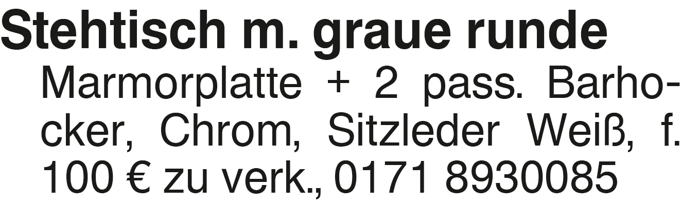Stehtisch m. grauer runde Stehtisch m. graue runde Marmorplatte + 2 pass. Barhocker, Chrom, Sitzleder Weiß, f. 100 EUR zu verk., 0171 8930085Kontakt