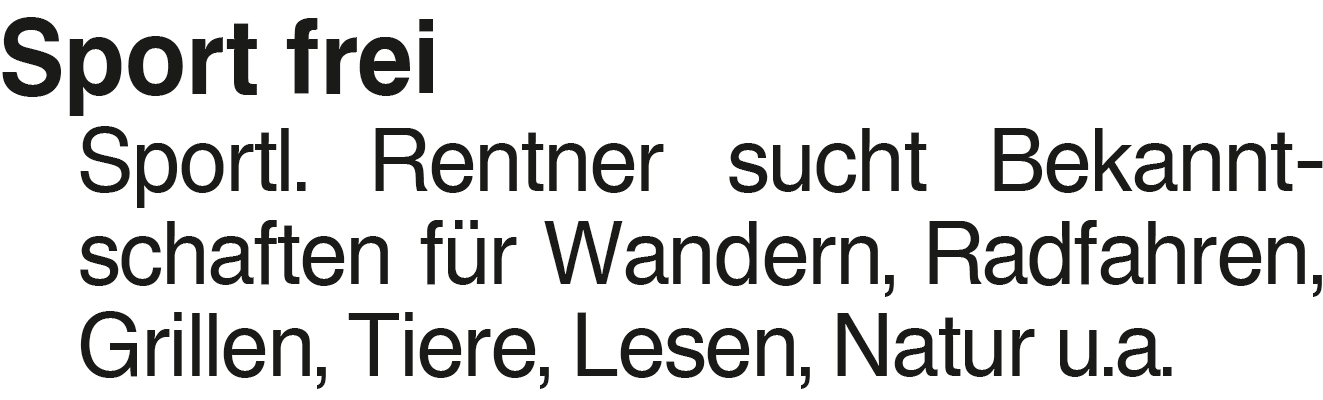 Sport frei Sportl. Rentne Sport frei Sportl. Rentner sucht Bekanntschaften für Wandern, Radfahren, Grillen, Tiere, Lesen, Natur u.a.Das könnte Sie auch interessieren