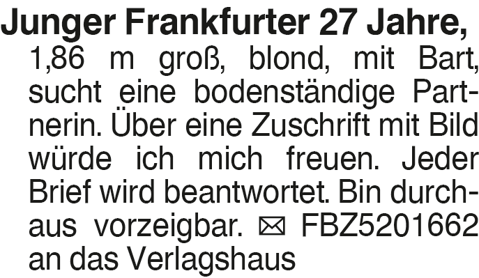 Junger Frankfurter 27 Jah Junger Frankfurter 27 Jahre, 1,86 m groß, blond, mit Bart, sucht eine bodenständige Partnerin. Über eine Zuschrift mit Bild würde ich mich freuen. Jeder Brief wird beantwortet. Bin durchaus vorzeigbar. FBZ5201662 an das VerlagshausDas könnte Sie auch interessieren