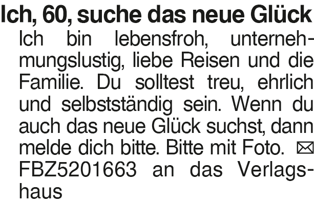 Ich 60 suche das neue Glü Ich, 60, suche das neue Glück Ich bin lebensfroh, unternehmungslustig, liebe Reisen und die Familie. Du solltest treu, ehrlich und selbstständig sein. Wenn du auch das neue Glück suchst, dann melde dich bitte. Bitte mit Foto. FBZ5201663 an das VerlagshausDas könnte Sie auch interessieren