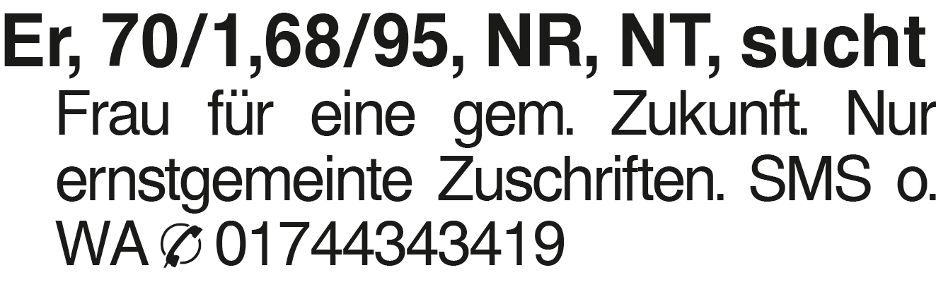 Er, 70/1,68/95, NR, NT, s Er, 70/1,68/95, NR, NT, sucht Frau für eine gem. Zukunft. Nur ernstgemeinte Zuschriften. SMS o. WA 01744343419Das könnte Sie auch interessieren