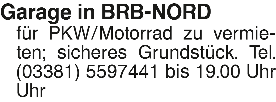 Garage in BRB-NORD für PK für PKW/Motorrad zu vermieten; sicheres Grundstück. Tel. (03381) 5597441 bis 19.00 Uhr UhrKontakt