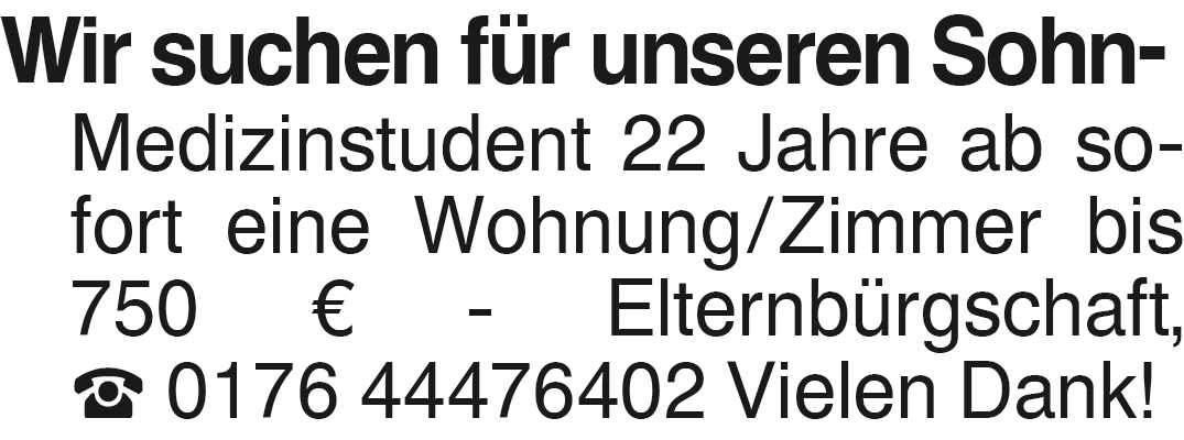 Wir suchen für unseren So Wir suchen für unseren Sohn- Medizinstudent 22 Jahre ab sofort eine Wohnung/Zimmer bis 750 EUR - Elternbürgschaft, 0176 44476402 Vielen Dank!Das könnte Sie auch interessieren