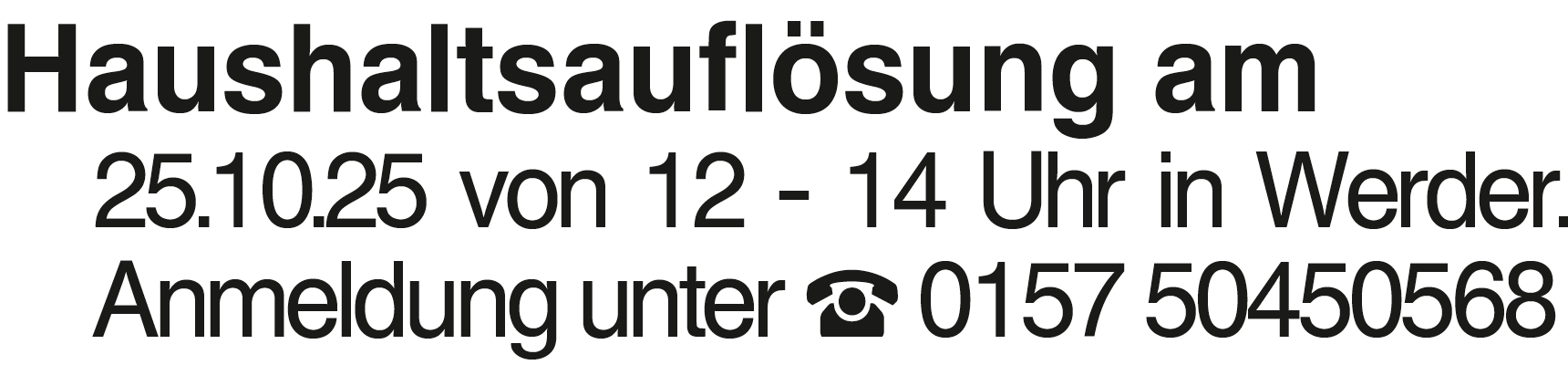 Haushaltsauflösung am 25. Haushaltsauflösung am 25.10.25 von 12 - 14 Uhr in Werder. Anmeldung unter 0157 50450568Das könnte Sie auch interessieren