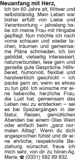 Erscheinungsdatum: Anzeige vom 18.10.2025 in der Rubrik "Ehe-/ Partnervermittlungen"