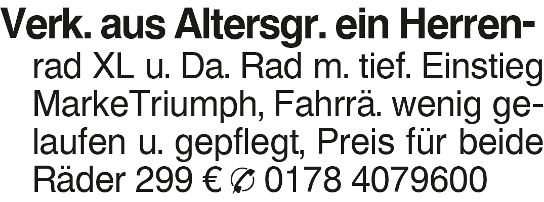 Verk. aus Altersgr. ein H Verk. aus Altersgr. ein Herren- rad XL u. Da. Rad m. tief. Einstieg MarkeTriumph, Fahrrä. wenig gelaufen u. gepflegt, Preis für beide Räder 299 EUR 0178 4079600Kontakt
