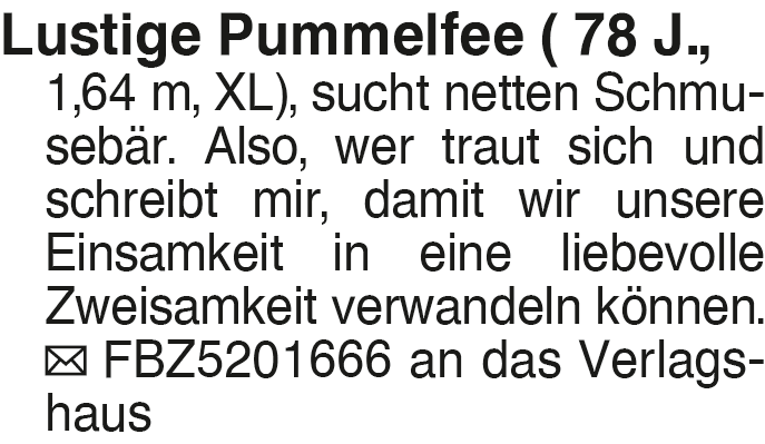 Lustige Pummelfee ( 78 J. Lustige Pummelfee ( 78 J., 1,64 m, XL), sucht netten Schmusebär. Also, wer traut sich und schreibt mir, damit wir unsere Einsamkeit in eine liebevolle Zweisamkeit verwandeln können. FBZ5201666 an das VerlagshausDas könnte Sie auch interessieren