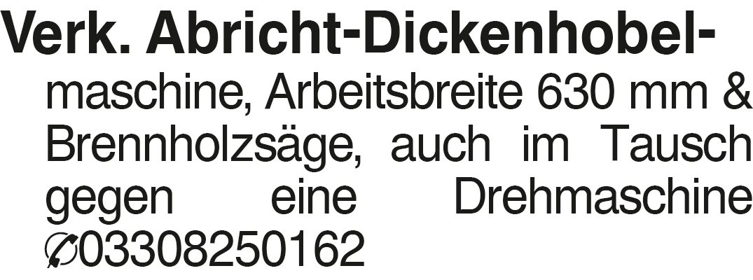 Verk. Abricht-Dickenhobel Verk. Abricht-Dickenhobel- maschine, Arbeitsbreite 630 mm & Brennholzsäge, auch im Tausch gegen eine Drehmaschine 03308250162Das könnte Sie auch interessieren