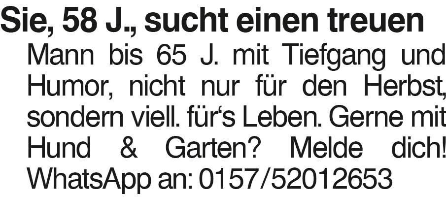 Sie, 58 J., sucht einen t Sie, 58 J., sucht einen treuen Mann bis 65 J. mit Tiefgang und Humor, nicht nur für den Herbst, sondern viell. für s Leben. Gerne mit Hund & Garten? Melde dich! WhatsApp an: 0157/52012653Das könnte Sie auch interessieren