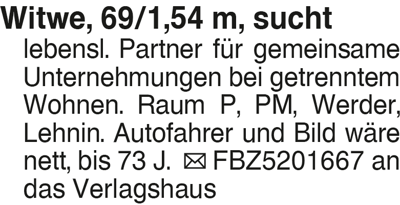 Witwe, 69/1,54 m, sucht l Witwe, 69/1,54 m, sucht lebensl. Partner für gemeinsame Unternehmungen bei getrenntem Wohnen. Raum P, PM, Werder, Lehnin. Autofahrer und Bild wäre nett, bis 73 J. FBZ5201667 an das VerlagshausDas könnte Sie auch interessieren