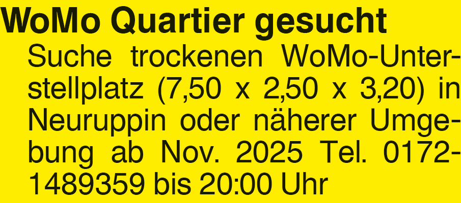 WoMo Quartier gesucht Suc Suche trockenen Unterstellplatz für WoMo (7,50 m x 2,50 m x 3,20 m) in Neuruppin oder näherer Umgebung ab Nov. 2025 Tel. 0172-1489359 bis 20:00 Uhr UhrKontakt