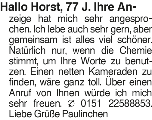 Hallo Horst, 77 J. Ihre A Hallo Horst, 77 J. Ihre An- zeige hat mich sehr angesprochen. Ich lebe auch sehr gern, aber gemeinsam ist alles viel schöner. Natürlich nur, wenn die Chemie stimmt, um Ihre Worte zu benutzen. Einen netten Kameraden zu finden, wäre ganz toll. Über einen Anruf von Ihnen würde ich mich sehr freuen. 0151 22588853. Liebe Grüße PaulinchenDas könnte Sie auch interessieren