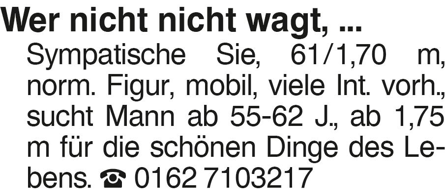 Wer nicht nicht wagt, ... Wer nicht nicht wagt, ... Sympatische Sie, 61/1,70 m, norm. Figur, mobil, viele Int. vorh., sucht Mann ab 55-62 J., ab 1,75 m für die schönen Dinge des Lebens. 0162 7103217Das könnte Sie auch interessieren