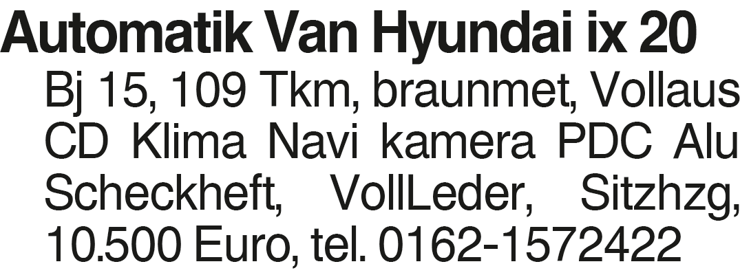 Automatik Van Hyundai ix Automatik Van Hyundai ix 20 Bj 15, 109 Tkm, braunmet, Vollaus CD Klima Navi kamera PDC Alu Scheckheft, VollLeder, Sitzhzg, 10.500 Euro, tel. 0162-1572422Das könnte Sie auch interessieren