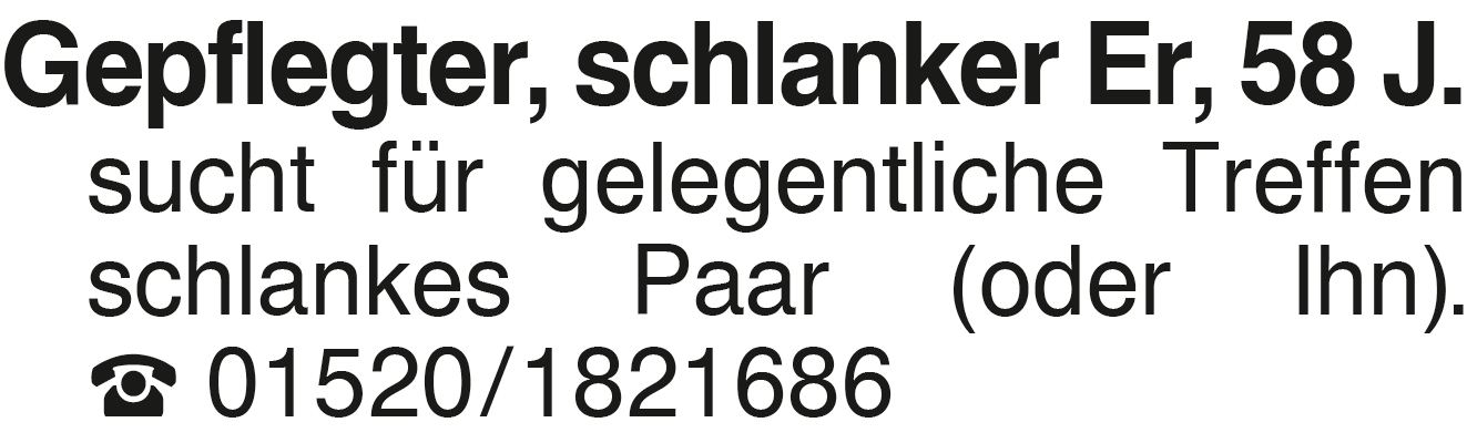 Gepfl. schlanker Er, 58 J Gepflegter, schlanker Er, 58 J. sucht für gelegentliche Treffen schlankes Paar (oder Ihn). 01520/1821686Das könnte Sie auch interessieren