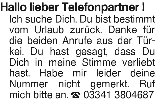 Hallo lieber Telefonpartn Hallo lieber Telefonpartner ! Ich suche Dich. Du bist bestimmt vom Urlaub zurück. Danke für die beiden Anrufe aus der Türkei. Du hast gesagt, dass Du Dich in meine Stimme verliebt hast. Habe mir leider deine Nummer nicht gemerkt. Ruf mich bitte an. 03341 3804687Das könnte Sie auch interessieren