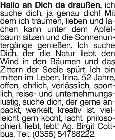 Irina Hallo an Dich da draußen, ich suche dich, ja genau dich! Mit dem ich träumen, lieben und lachen kann unter dem Apfelbaum sitzen und die Sonnenuntergänge genießen. Ich suche Dich, der die Natur liebt, den Wind in den Bäumen und das Zittern der Seele spürt. Ich bin mitten im Leben, Irina, 52 Jahre, offen, ehrlich, verlässlich, sportlich, reise- und unternehmungslustig, suche dich, der gerne anpackt, werkelt, kreativ ist, vielleicht gern kocht, lacht, philosophiert, liebt, lebt! Ag. Birgit Cottbus, Tel.: (0355) 54788222.Das könnte Sie auch interessieren