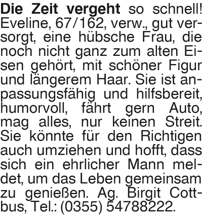 Eveline Die Zeit vergeht so schnell! Eveline, 67/162, verw., gut versorgt, eine hübsche Frau, die noch nicht ganz zum alten Eisen gehört, mit schöner Figur und längerem Haar. Sie ist anpassungsfähig und hilfsbereit, humorvoll, fährt gern Auto, mag alles, nur keinen Streit. Sie könnte für den Richtigen auch umziehen und hofft, dass sich ein ehrlicher Mann meldet, um das Leben gemeinsam zu genießen. Ag. Birgit Cottbus, Tel.: (0355) 54788222.Das könnte Sie auch interessieren