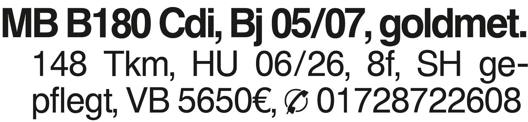MB B180 Cdi, Bj 05/07, gol MB B180 Cdi, Bj 05/07, goldmet. 148 Tkm, HU 06/26, 8f, SH gepflegt, VB 5650 EUR, 01728722608Kontakt