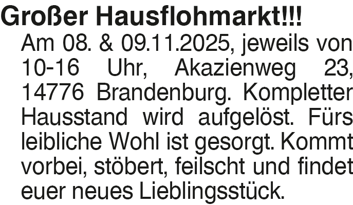 Großer Hausflohmarkt!!! A Großer Hausflohmarkt!!! Am 08. & 09.11.2025, jeweils von 10-16 Uhr, Akazienweg 23, 14776 Brandenburg. Kompletter Hausstand wird aufgelöst. Fürs leibliche Wohl ist gesorgt. Kommt vorbei, stöbert, feilscht und findet euer neues Lieblingsstück.Das könnte Sie auch interessieren