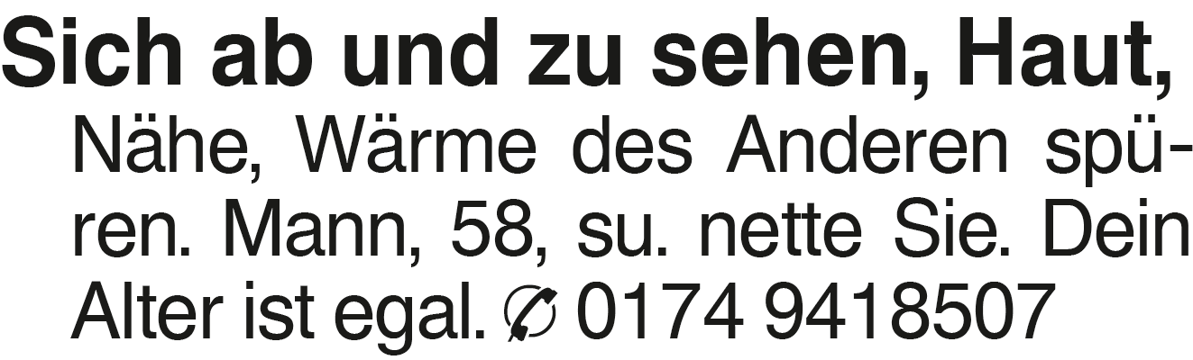 Sich ab und zu sehen, Hau Sich ab und zu sehen, Haut, Nähe, Wärme des Anderen spüren. Mann, 58, su. nette Sie. Dein Alter ist egal. 0174 9418507